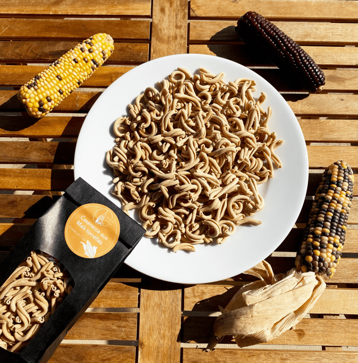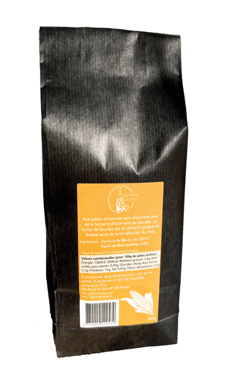 Nos pâtes artisanales sont élaborées avec de la farine traditionnelle de Gaudes. La farine de Gaudes est un aliment typique de Bresse issue de la torréfaction du maïs.