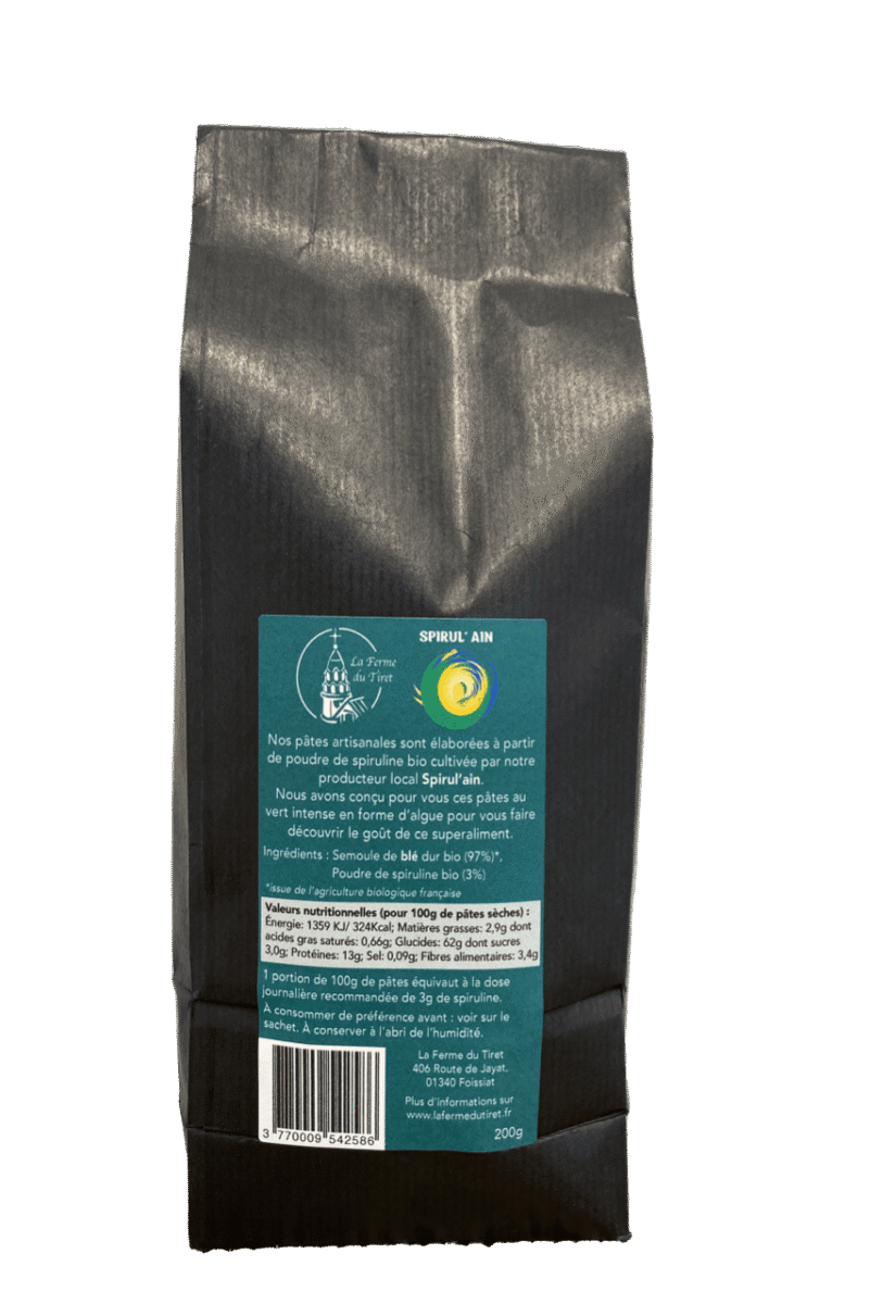 Nos pâtes artisanales sont élaborées à partir de poudre de spiruline cultivée par notre producteur local Spirul’ain. Nous avons conçue pour vous ces pâtes au vert intense en forme d’algue pour vous faire découvrir le goût de ce superaliment.
